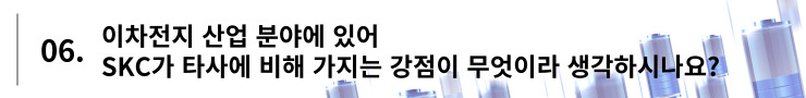 김태현 매니저 : SKC는 글로벌 1위 전해 동박 제조 기술을 기반으로, 주요 배터리 회사들과 긴밀한 협업 관계를 유지하고 있습니다. 이를 통해 개발 중인 배터리에 필요한 소재를 지속적으로 follow-up*하여 타사 대비 빠르게 기술 우위에 도달할 수 있다는 강점이 있습니다.