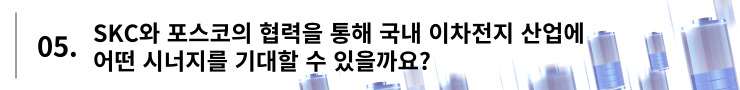 SKC가 보유한 음극 집전체 기술력을 바탕으로, 차세대 음극소재까지 기술력을 확장하여 이차전지 소재 산업의 혁신 패러다임을 제공할 것입니다. SKC의 우수한 소재 기술력과 포스코그룹의 막강한 인프라의 시너지를 통해 차세대 이차전지 소재 시장에서 강력한 리더십을 확보할 수 있을 것이라 기대됩니다.