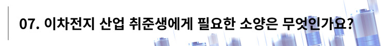 김태현 매니저 : 첫째는 전문성입니다. 이차전지 산업은 전극, 전해, 분리막, 집전체 등 다양한 분야로 세분화 되어있기 때문에, 지원하고자 하는 분야에 맞는 경험과 전공 지식을 습득하고 본인의 전문성을 어필하는 것이 중요합니다. 둘째는 어학 능력입니다. 업계 특성 상 여러 글로벌 배터리 관련 기업들과 협업을 진행하게 되기 때문에, 원활한 커뮤니케이션을 위한 어학 능력이 필요할 것이라고 생각합니다.