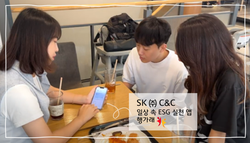 일상생활 속 두 번째 관계사는 SK㈜ C&C이다. 디지털과 ESG의 확산이라는 환경 변화 속에서 경제적, 사회적 가치뿐만 아닌 이해관계자의 행복까지 함께 만들어 낼 수 있는 비즈니스 모델을 구축한 SK㈜ C&C는 ‘행가래’라는 앱을 통해 만날 수 있었다. [5] ESG활동을 일상 생활속에서 실천 가능하게 해준 앱 행가래는 ‘행복(幸)을 더하는(加) 내일(來)을 만들자’라는 의미를 담고 있다. 앱을 통해 계단 이용, 개인 컵 사용과 같은 활동에 대한 포인트를 지급받을 수 있으며, 포인트가 쌓이면 기부와 사회적 기업 물품 구매가 가능하다. 우리도 예지님처럼, 행가래 앱을 통해 작은 실천부터 차근차근 시작해보면 어떨까? [6]