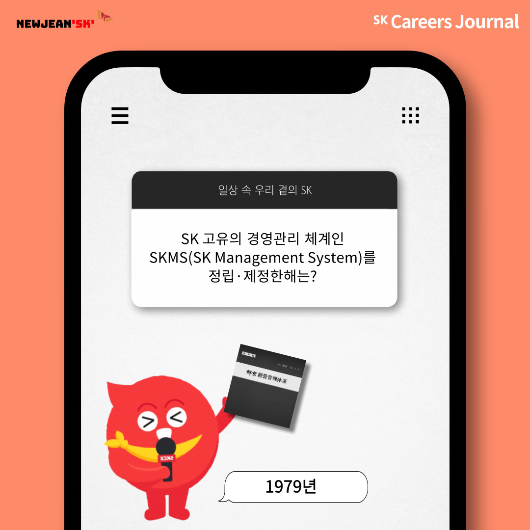 SK 고유의 경영관리 체계인 SKMS(SK Management System)를 정립·제정한 해는 바로 ‘1979년’입니다. SKMS를 정립·제정함으로써 SK의 경영근간을 마련했습니다. SKMS는 SK 구성원 모두의 합의와 공유를 통해 SK 기업문화를 구축하는 기반이 되어 왔습니다. SK가 지금까지 지속적 성장과 발전을 거듭해 온 데에는 SKMS를 토대로 한 경영활동과 기업문화의 정착이 매우 큰 역할을 하였다고 할 수 있습니다.