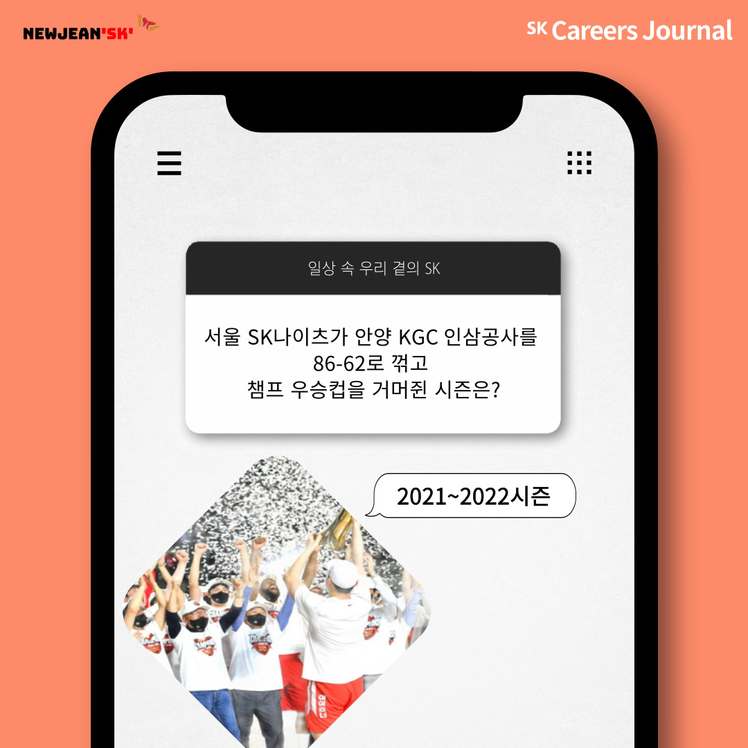 SK 하면, 스포츠 이야기를 빼놓을 수 없죠? 서울 SK 나이츠는‘2021-2022 정관장 프로농구 챔피언결정전’에서 안양 KGC 인삼공사를 86-62로 꺾고 1999~2000시즌, 2017~2018시즌 이후 세 번째 챔프 우승컵을 거머쥐었습니다. 2023~2024시즌 프로농구는 2023년 10월 21일 토요일 개막해 2024년 03월 31일 일요일 종료됩니다. 이번 시즌 개막전은 지난 시즌 챔피언 결정전에서 맞붙었던 서울 SK 나이츠와 안양 정관장 레드부스터즈의 경기로 진행될 예정입니다.