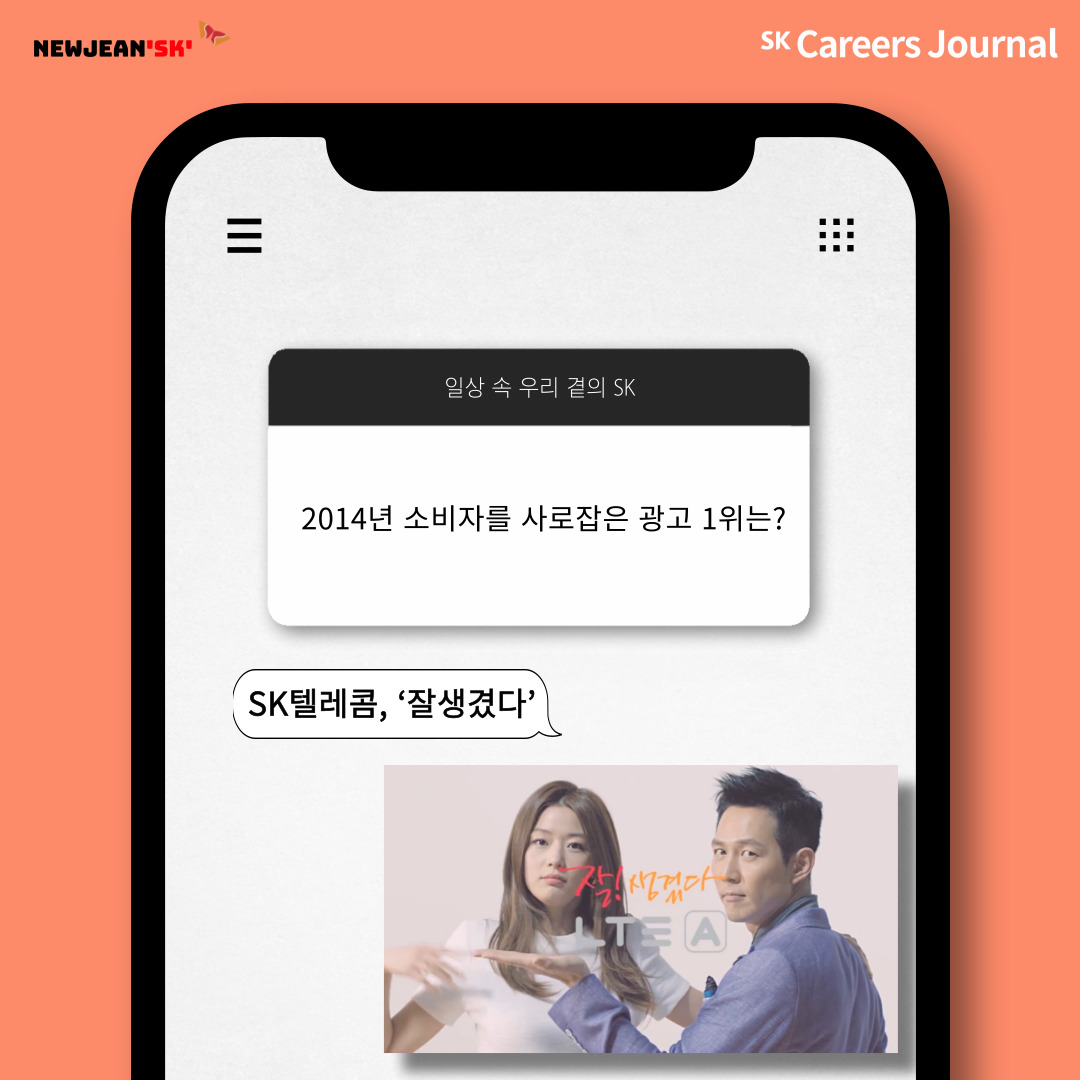 여러분의 머릿속에 떠오르는 SKT 광고는 무엇인가요? ‘생각대로 T’를 포함한 다양한 광고를 떠올리실 것 같은데요, 2014년 기준 소비자를 사로잡은 광고 1위는 SKT의 ‘잘생겼다’입니다. 본 광고는 SKT의 LTE-A 서비스를 홍보하기 위해 기획된 광고입니다. LTE-A 서비스는 기존 LTE보다 3배 빠른 '광대역 롱텀에볼루션어드밴스트(LTE-A)' 서비스로 SKT가 세계 최초 상용화에 성공했습니다.