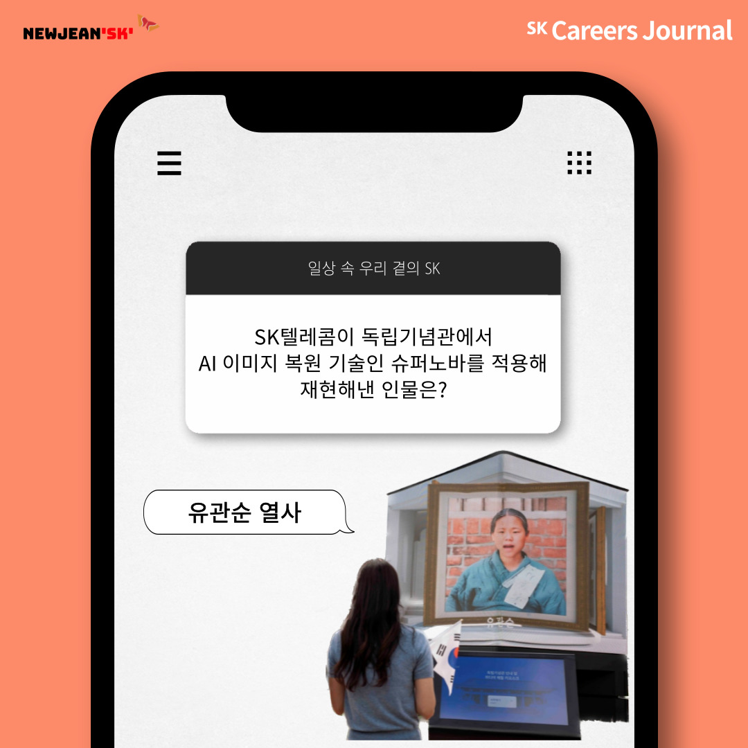 SK의 AI 기술은 독립운동의 역사를 생생하게 재현하는 것에도 활용되고 있습니다. SKT는 독립기념관에서 유관순 열사의 모습을 재현해 냈습니다. AI 이미지 복원 기술인 슈퍼노바를 적용한 것입니다. 독립운동가 모습이 담긴 훼손된 흑백사진을 슈퍼노바와 첨단 ICT 기술을 통해 고화질로 복원한 후 컬러 이미지로 전환하고 미디어 재현 기술을 적용해 실감 나는 영상 콘텐츠로 제작해 냈습니다. 이외에도 독립기념관 체험관에서는 실시간 대화를 통해 관람을 안내하는 AI 미디어 로봇을 마주할 수 있고, QR코드를 인식함으로써 AR 증강현실을 체험할 수 있습니다.