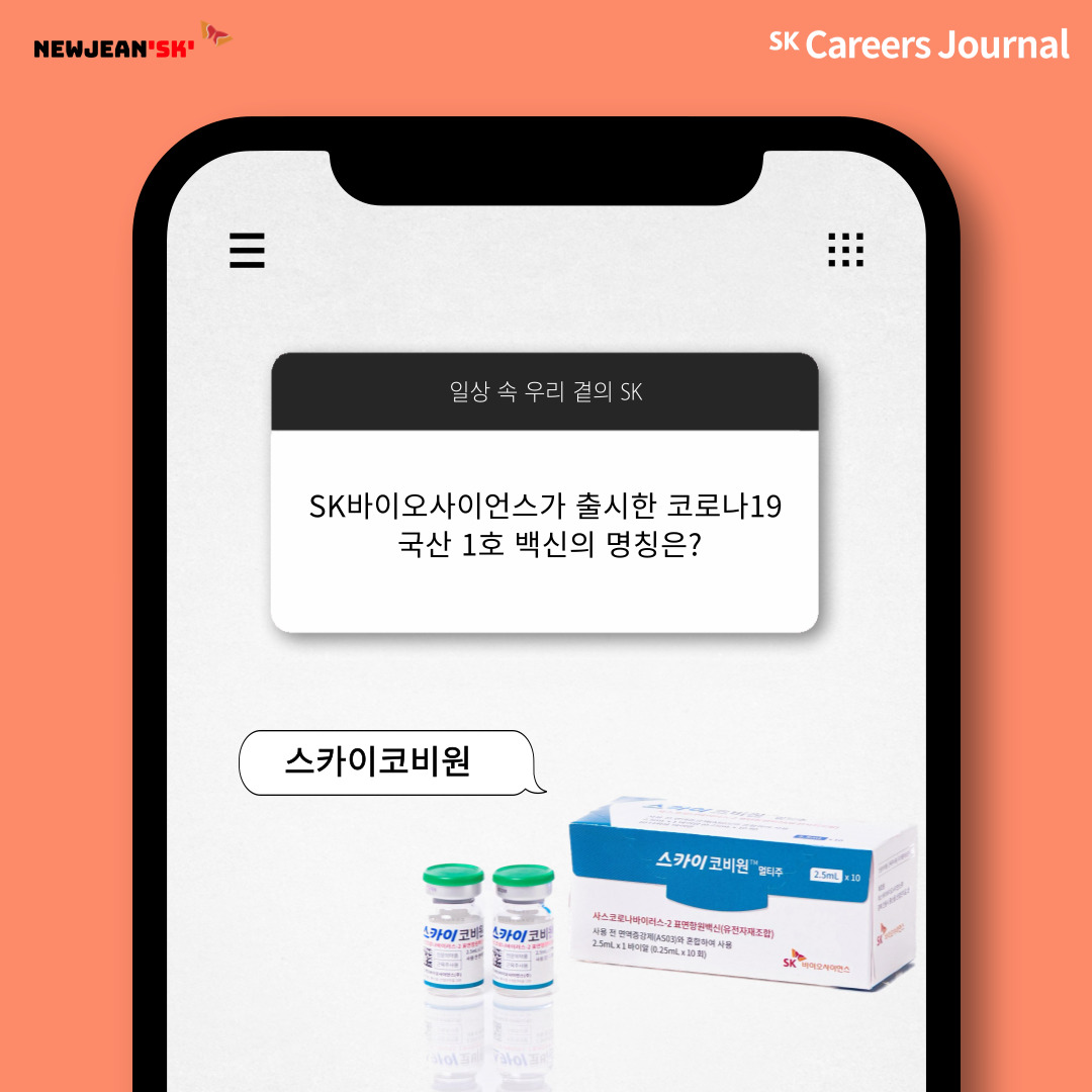 SK는 건강한 사회와도 밀접한 연관이 있습니다. SK바이오사이언스가 출시한 코로나19 국산 1호 백신은 바로 스카이코비원입니다. SK바이오사이언스는 코로나19 엔데믹 시대의 방역을 주도하고, 더 나아가 중저개발국의 원활한 백신 공급에 기여하겠다는 목표를 갖고 있습니다. SK바이오사이언스는 코로나19 백신개발에 그치지 않고 넥스트 펜데믹에 대응하기 위한 백신 개발에 앞장서고 있습니다.