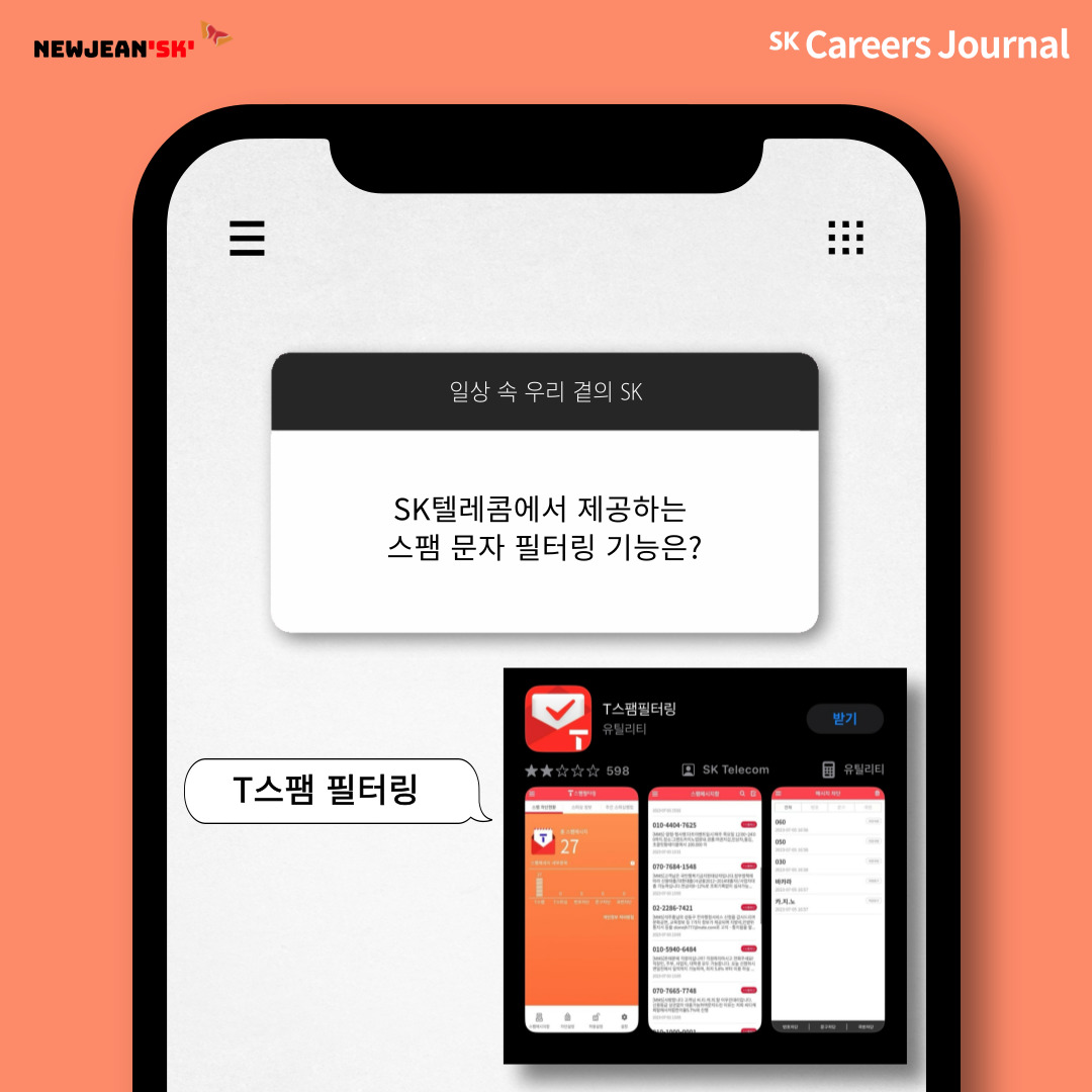 ‘T스팸 필터링’은 2011년부터 SK텔레콤에서 연령 제한 없이 전고객에게 제공하는 스팸 필터링 서비스입니다. 구글 플레이와 앱스토어에서 다운로드 받을 수 있습니다. 고객들은 원하는 문구 및 번호를 차단(또는 허용) 등록해 사용할 수 있으며, 스팸 차단 강도(상> 중> 하)를 설정해 강도에 따라 더 많은 스팸을 차단할 수 있습니다.