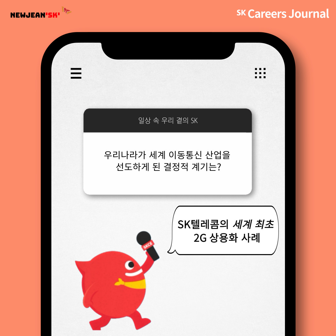 SK텔레콤은(이하 ‘SKT’) 1996년 1월 세계 최초로 *CDMA 디지털 이동전화를 상용화해 세계 최초 2G 상용화에 성공했습니다. 이는 우리나라가 이동 통신 기술 주도국으로, 시스템과 단말기 수출 강국으로 변모하는 데에 일조했으며, 이후 꾸준히 ‘세계 최초 상용화’에 도전하며 국내 1위 통신사로 자리매김하게 되었습니다.