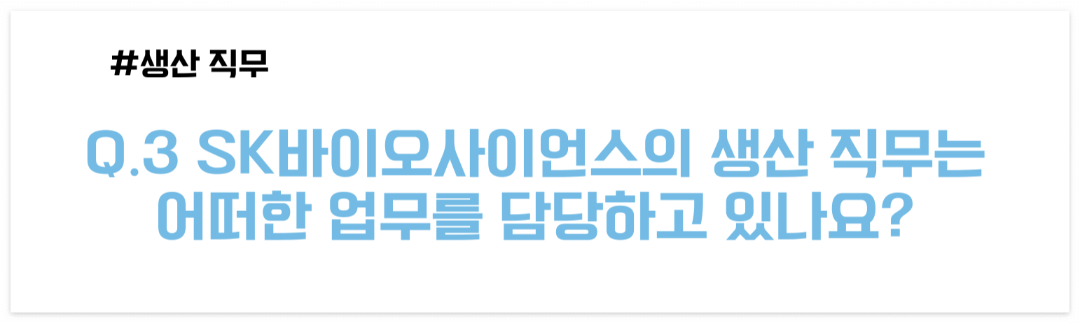 오늘 소개해드릴 직무는 이 중 ‘생산 직무’인데요, SK바이오사이언스 생산 공장에서 근무하고 계시는 생산 직무를 담당하고 계신 인터뷰이님을 소개합니다. 😊