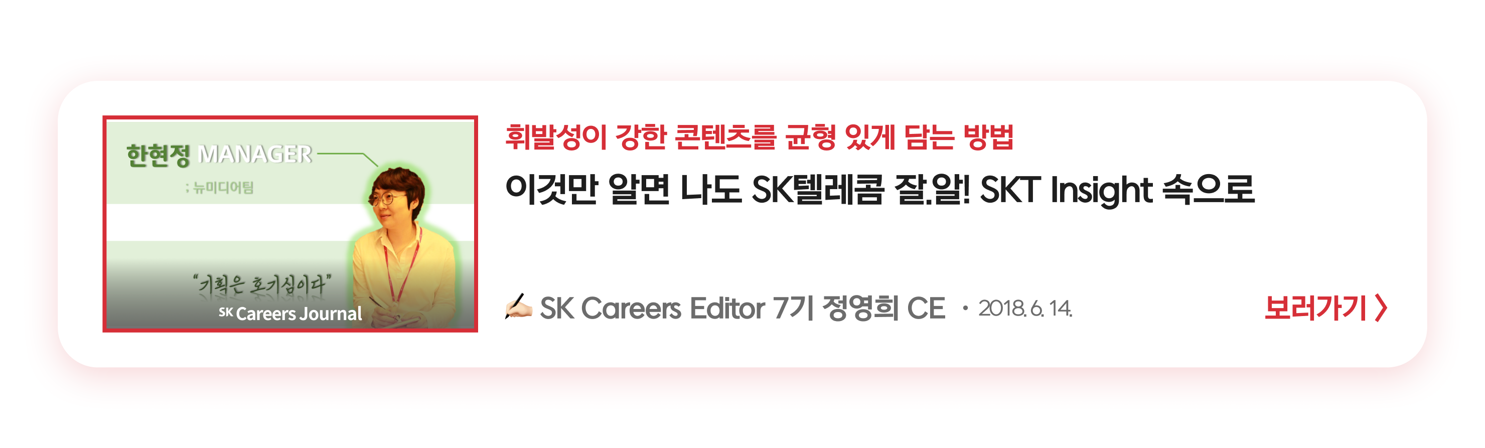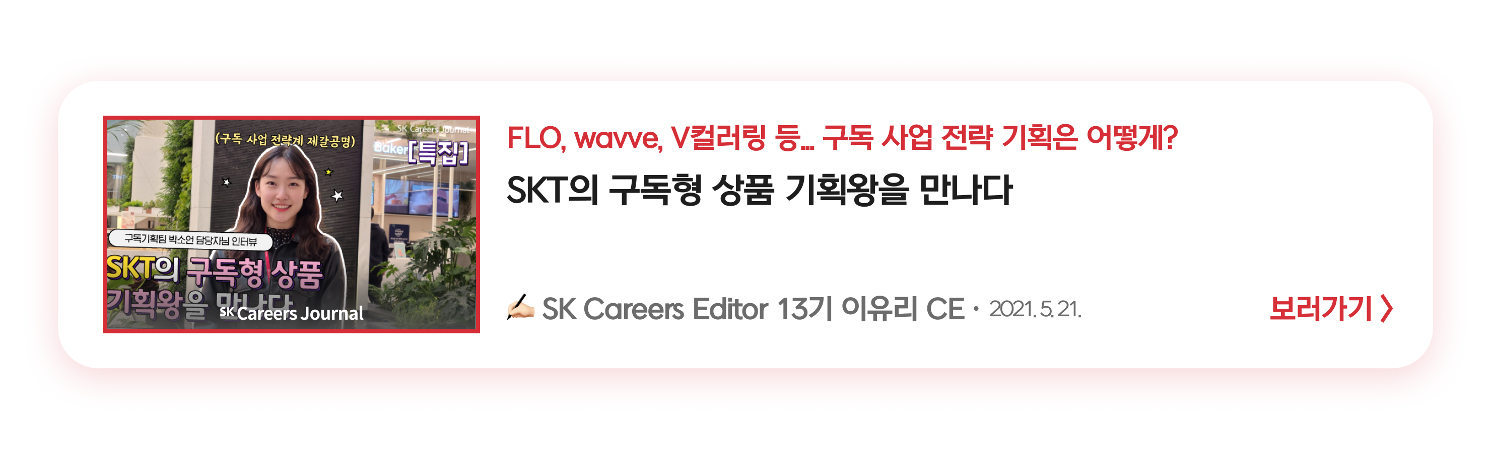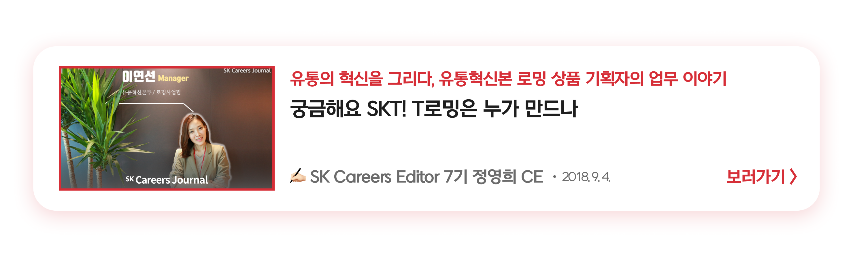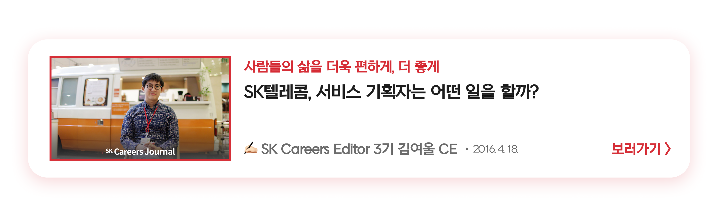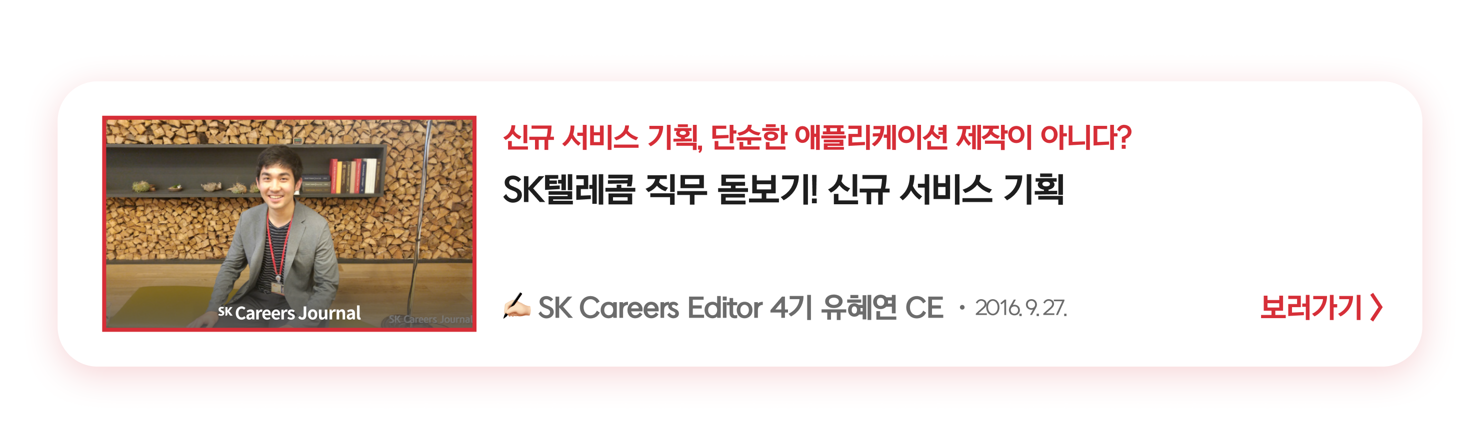 SK텔레콤의 기술과 콘텐츠를 접목하여 이전에 없던 서비스를 기획하는 기획자.