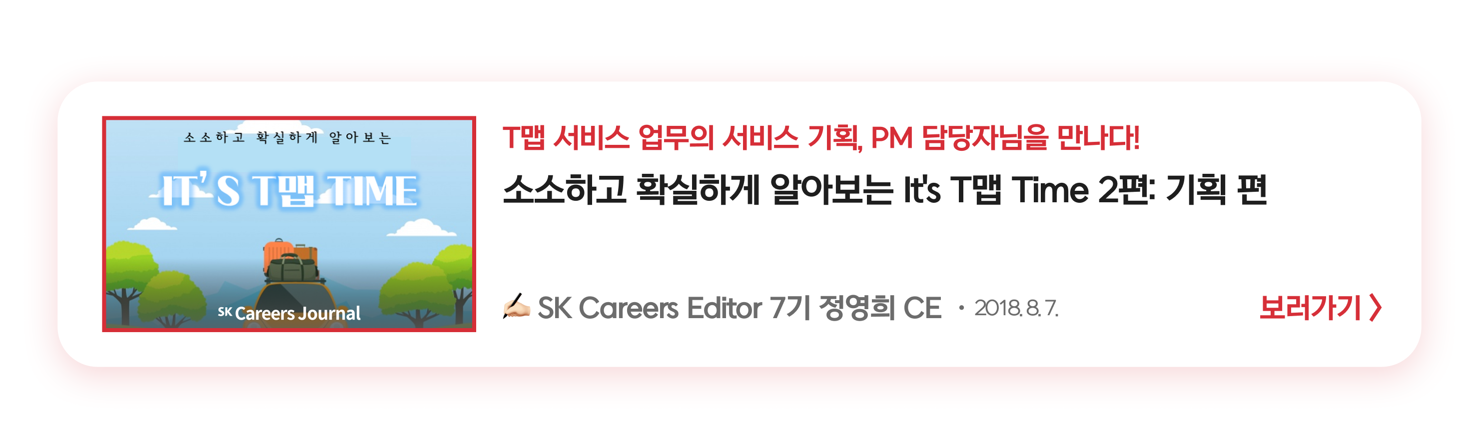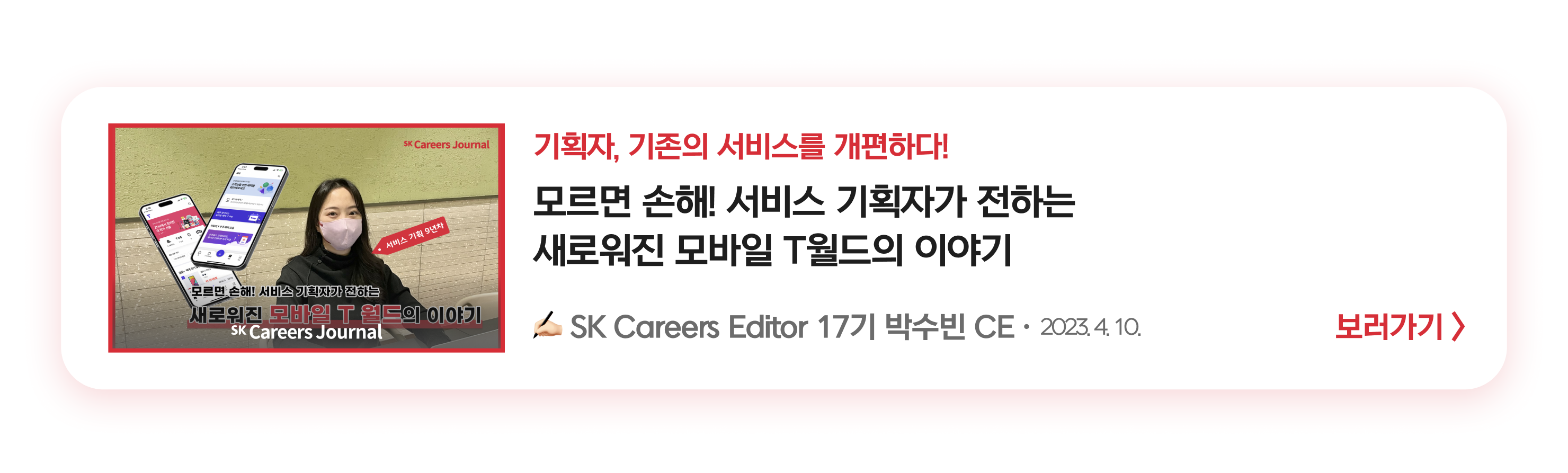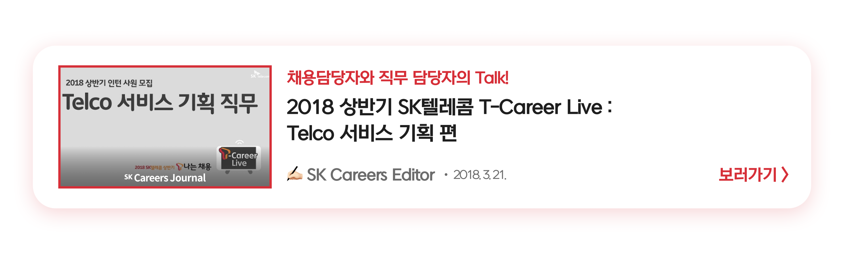 채용담당자와 서비스 기획 직무 담당자가 펼치는 SK텔레콤의 서비스 기획 직무 이야기를 만나보세요.
