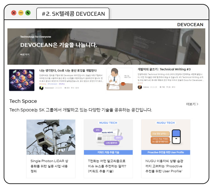 다음으로 소개드릴 기술 블로그는 SK텔레콤의 DEVOCEAN인데요! 데보션은 “개발자들을 위한 영감의 바다”라는 뜻으로, SK텔레콤에서 출시한 개발자 커뮤니티입니다. 개발자들의 서비스 개발기나 관련 IT 지식 등이 다양하게 담겨있어, 표현 그대로 영감의 바다라고 할 수 있는데요! 뿐만 아니라 SK 그룹에서 개발하고 있는 다양한 기술을 공유하는 공간인 Tech Space까지도 구성되어 있답니다.