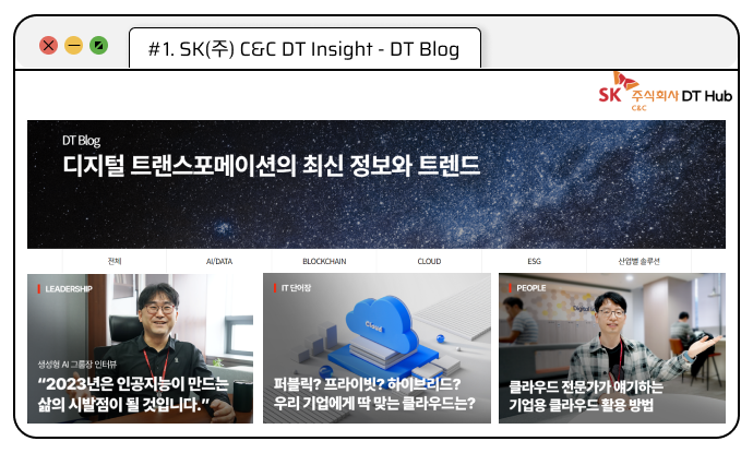 SK㈜ C&C에서는 DT 인사이트를 얻을 수 있는 블로그를 운영하고 있습니다! IT 트렌드를 전달하는 데 초점을 맞추고 있습니다. AI, Bigdata, Cloud, Blockchain 등 디지털 기술 개념과 활용 사례들이 궁금하다면? SK㈜ C&C의 DT Insight를 추천합니다!