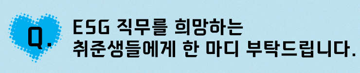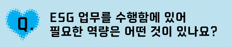 때문에 ESG와 관련해서 어떠한 논의가 글로벌에서 이뤄지고 있는지, 규제 및 공시 의무 등의 시행 시점은 언제인지를 파악해야 하는데요. 이를 위해서는 리서치 능력과 영어에 대한 역량이 있으면 도움이 많이 되실 겁니다. 기업 담당자로서는 여러 부서와 커뮤니케이션을 하며 ESG경영에 대한 이해를 돕고, 결과를 이끌어 내야하기 때문에 커뮤니케이션 능력이 매우 중요합니다.
