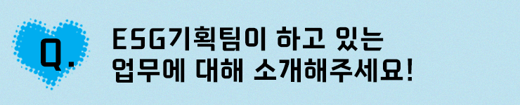 저희 팀은 지속가능경영보고서, 그룹 ESG 핵심지표 평가 대응, 넷제로, 지역재생 프로젝트 등 주로 ESG 기획 업무를 맡고 있습니다.