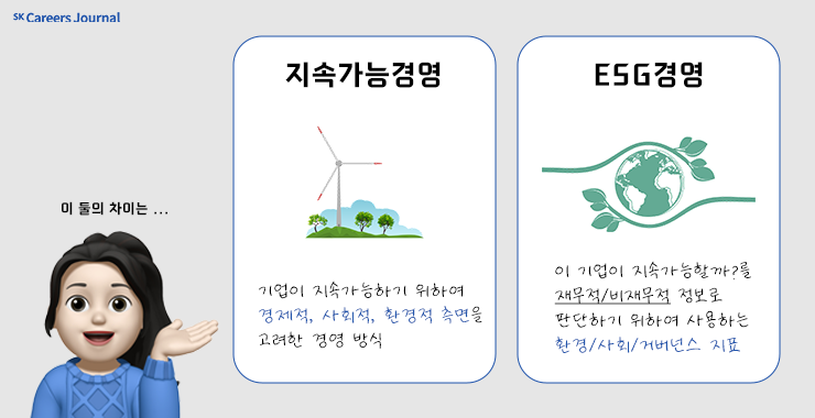 지속가능경영은 기업이 지속가능하기 위하여 경제적, 사회적, 환경적 측면을 고려한 경영 방식입니다. ESG경영의 경우, 투자자들 관점에서 이 기업이 지속가능할까?를 재무적 정보 외 비재무적 정보로도 판단하기 위하여 사용하는 환경/사회/거버넌스 지표라고 이해하시면 됩니다. 이 평가에 따라 투자가 철회되기도 하고 계약이 중단되기도 하기 때문에 현재 국내외 많은 기업들이 이 ESG경영에 주목하고 있는 것입니다.