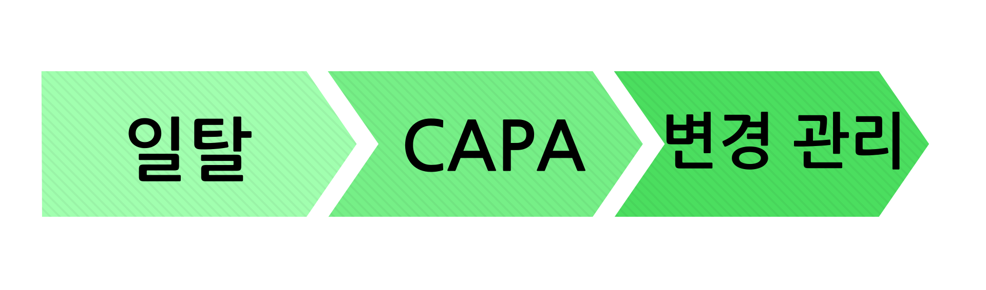 제가 하고 있는 품질보증 직무에서 특별하게 꼽자면 일탈, CAPA, 변경 관리가 있겠습니다.