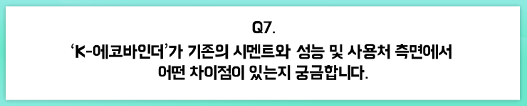 다만, 생활폐기물 소각재가 주원료로 사용되다 보니 일반시멘트 대비 Cl(염소) 성분이 많아 현행 기준으로 철근과 사용이 불가하여 현재는 보도블록 경계석, 도로 방호벽 등에 우선적으로 사용하려고 하는 상황입니다. 그러나 저희가 작년에 개발한 ‘녹이 슬지 않는 철근 대체재’인 <K-에코바>와 함께 사용하는 방식으로 점차 적용 제품을 확대할 계획을 가지고 있습니다.
