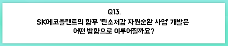 이처럼 앞으로도 SK에코플랜트의 향후 탄소저감 자원순환 사업 개발은 대내외 환경적인 Pain Point 해결과 동시에 사업화가 가능한 아이템을 중심으로 이루어질 것이라고 생각합니다.
