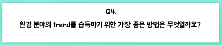 저는 개인적으로 업무 수행을 위해 관련 학회의 자료 및 논문을 찾아보는 편이고, 환경 기술의 연구 개발 현황을 알아보기 위해 각종 학회의 세미나에 참여하기도 합니다.