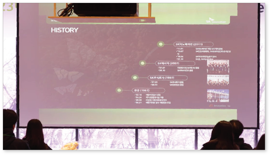 어느 정도 풀어진 분위기에서 SK이노베이션이 에너지&정유화학 회사로서 성장해 온 연혁을 톺아 보는 시간을 가졌습니다. 이어서 SK이노베이션 계열사를 하나하나 간략히 소개했는데요, 본인과 함께하게 될 회사의 과거부터 미래를 알아보며 회사의 비전에 관한 설명까지 듣게 되어 신입사원들에게 무척 와닿는 시간이었을 것 같습니다.