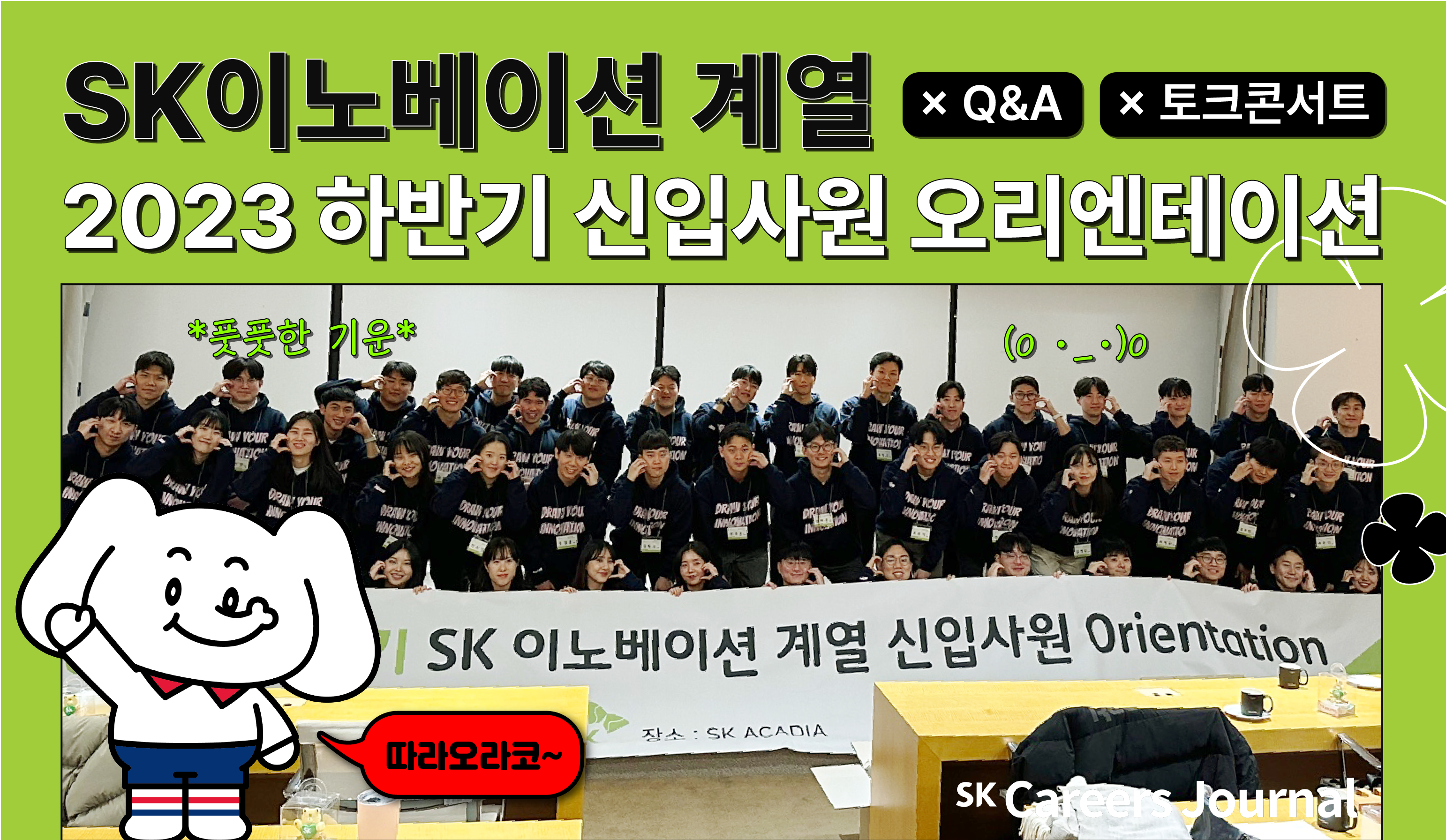 오리엔테이션 오프닝 전, 모든 신입사원이 SK이노베이션 단체 후드티로 환복하고 회의실에 모였는데요. SK이노베이션의 마스코트 행코가 그려진 귀여운 뒷모습을 잔뜩 볼 수 있었습니다!