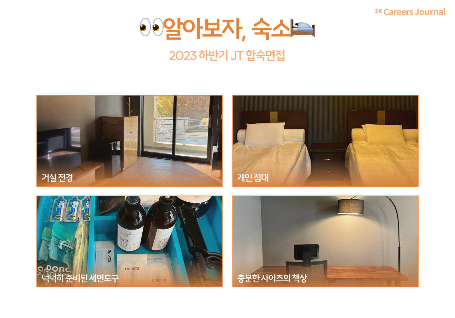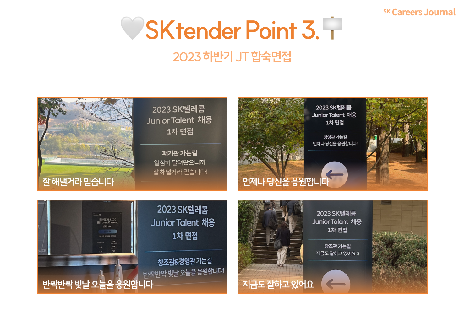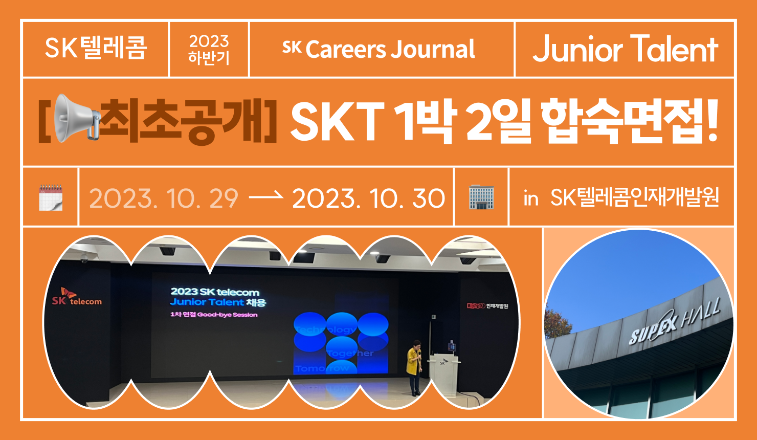 SK텔레콤 CE들이 직접 다녀와 취재해온 최초⭐️단독 2023 SK텔레콤 JT 채용 합숙면접 현장! 그중에서도 고객/서비스/Staff 직군이 진행되었던 10월 어느 날의 1박 2일을 담아왔습니다. 텔레콤만큼 따뜻했던 합숙면접 현장을 여러분께 최초로 공개해 드립니다. 아마 이 기사를 모두 읽고 나시면 지금까지 악명 높았던 그 합숙면접은 잊어버리실 거예요!