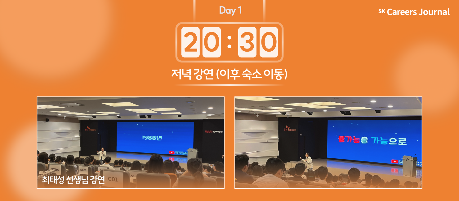 인터뷰 참여자 4 : 저는 저녁 강연이 가장 인상 깊었습니다. 굉장히 유명하신 최태성 강사님의 SK의 비전과도 맞닿아있는 메시지의 강연을 들으며, SK텔레콤이 얼마나 채용에 진심인지 면접자에 대한 배려가 얼마나 큰지 느낄 수 있었습니다.