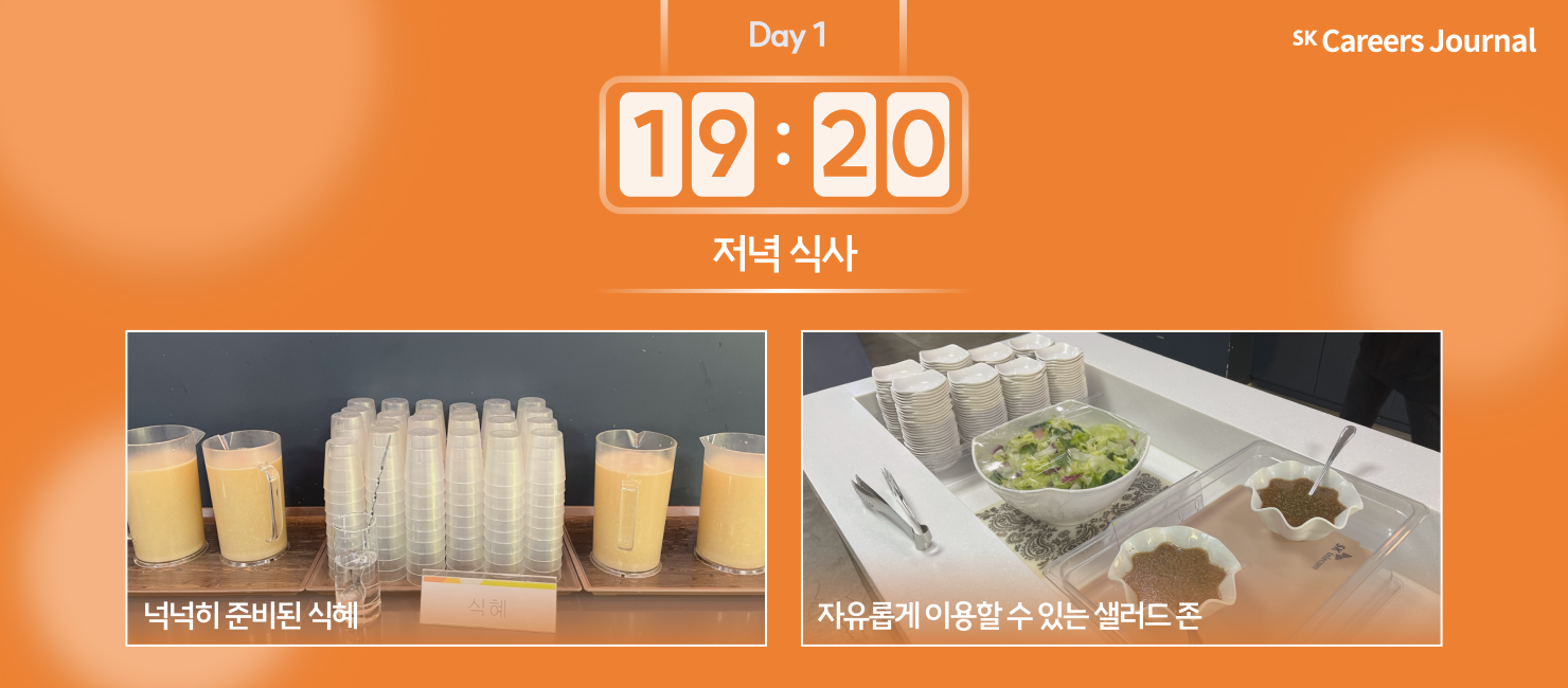 맛있기로 소문난 SK텔레콤 합숙면접 식사, 메뉴 자랑은 이제 입 아프죠! 메뉴는 물론 한 켠에 넉넉히 준비된 음료와 자유롭게 이용할 수 있는 샐러드 존까지, 저녁도 완벽했습니다🤩