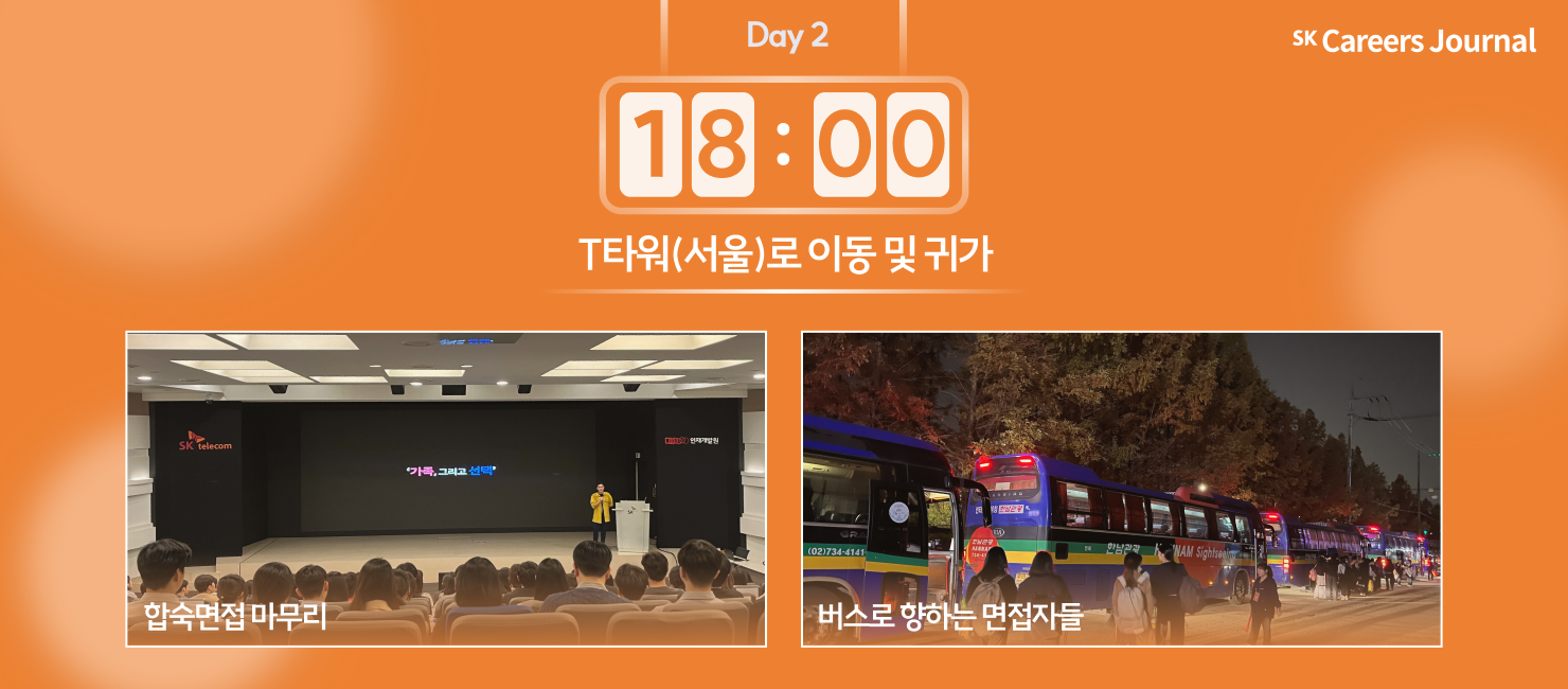 ‘그냥 면접도 떨리는데 합숙면접!?’, ‘대체 1박 2일 동안 무슨 면접을 보는 건데!?’라는 생각이 머릿속을 스쳐갔나요? 단시간 면접에서의 짧은 시간, 운과 변수 등의 단점을 보완하고 역량과 잠재력을 아낌없이 보여줄 수 있는 SK텔레콤만의 1박 2일 합숙면접!
