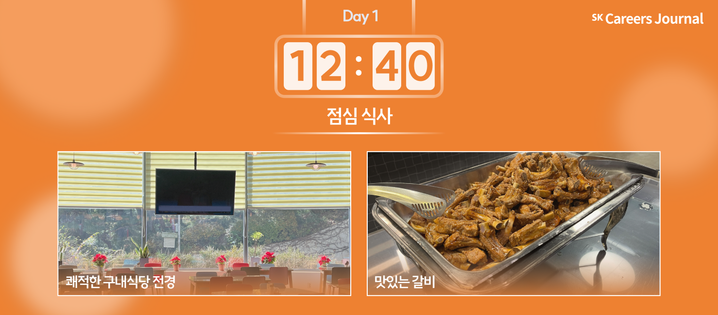 오전 첫 면접이 끝나고 점심 식사를 하러 패기관 지하 1층으로 향했습니다. 맛있기로 소문이 자자한 SK텔레콤 합숙면접 식사🍴 역시 이번에도 영양과 정성이 가득한 맛있는 음식들로 가득했습니다. 첫째 날 점심의 하이라이트는 맛있는 갈비!🍖
