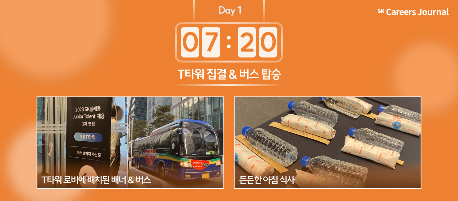 가을의 상쾌한 기운이 가득했던 아침! 합숙면접 장소인 이천 SK텔레콤인재개발원으로의 이동을 위해 T타워에 집결했습니다. 이동하는 동안 따뜻한 버스에서 속을 든든히 할 간단한 아침 식사를 준비해 주셨어요🍙 또, T타워 로비 곳곳에 헷갈리지 않도록 배치된 배너를 따라 버스에 탑승했습니다.