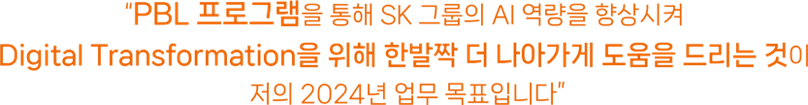 2024년에도 mySUNI와 함께 PBL 프로그램을 운영하면서 과제 별 멘토링을 제공할 예정입니다. 올해 보다 더 많은 멤버사와 다양한 조직의 구성원 분들께서 참여하실 수 있도록 프로그램을 확대 운영할 계획이며, 데이터 분석, ML/DL/AI를 활용하여 문제 해결을 위한 멘토링뿐만 아니라 데이터 분석 경험이 적으신 구성원 분들께서도 PBL 프로그램에 쉽게 참여하실 수 있도록 생성형 AI(Chat GPT) 기술을 활용한 PBL 프로그램도 기획 운영할 예정입니다. PBL 프로그램을 통해 SK 그룹의 AI 역량을 향상시켜 Digital Transformation을 위해 한발짝 더 나아가게 도움을 드리는 것이 저의 2024년 업무 목표입니다.