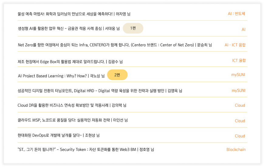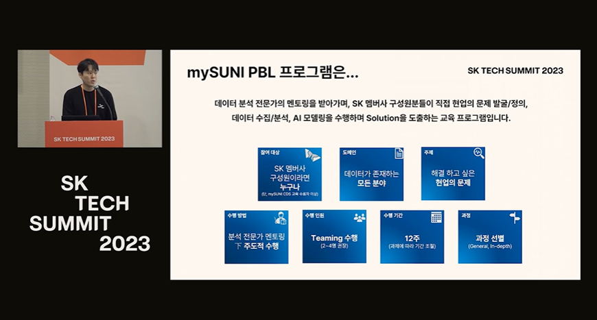 올 한 해 동안 mySUNI와 함께 mySUNI PBL(Project-Based Learning) 프로그램을 운영하였으며, 과제 별 멘토 역할을 수행하였습니다. 2023 SK Tech Summit을 통해 PBL 프로그램에 대한 소개와 함께 성공적으로 진행된 2023년도 운영 결과와 대표 사례를 공유 드리고, 2024년에도에 더 많은 멤버사들의 PBL 프로그램 참여를 유도하고자 강의를 진행하게 되었습니다.