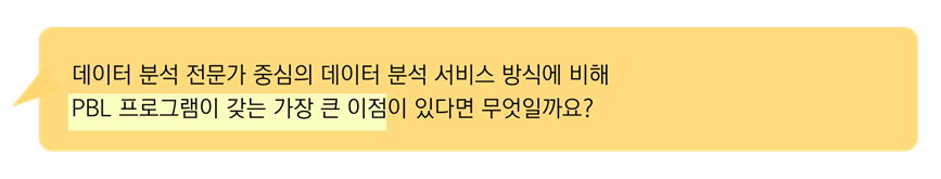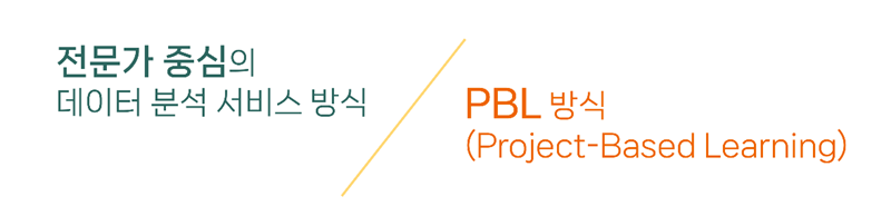 데이터 분석 서비스는 데이터 분석 전문가가 현업과의 인터뷰를 통해 문제를 발굴하고 데이터 분석, 모델링, 현장 적용 등을 통해 현업의 Needs를 충족시킬 수 있는 솔루션을 제공해드리는 서비스입니다. PBL 프로그램의 경우 멤버사의 참여 구성원 분들께서 직접 과제 발굴, 분석 수행, 모델링 및 현장 적용을 하실 수 있도록 저희가 멘토링을 제공해 드리는 교육 프로그램입니다.