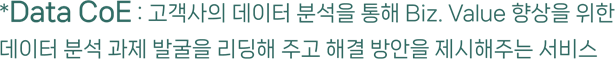Data CoE는 주로 고객사의 DT 조직과 협업하여 현업 부서와의 데이터 기반의 컨설팅을 통해 문제를 발굴, 수행하는 방식으로 진행됩니다. SK㈜ C&C Data Science 팀은 제조/서비스/금융 등 다양한 Industry에서의 Biz. Value Chain(R&D, 구매, 생산, 조립, 설비, 공정, 물류, 판매, 마케팅, 고객서비스, 상담, 경영관리 등)에서의 Data CoE 수행 경험과 사례를 보유하고 있습니다. SK이노베이션, SKC, SKGC, SK케미칼 등 SK멤버사와 다양한 외부 고객사에서 SK C&C의 Data CoE 서비스를 이용하고 있습니다.