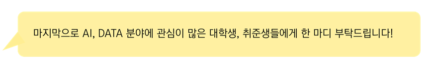 Data 분석 및 AI 개발 업무를 진행하면서 무엇보다 중요하다고 느낀 점은 스스로 문제를 정의하고 해결 가능한 해법을 제시하는 능력과 이러한 과정에서 타인을 이해시키고 설득시킬 수 있는 커뮤니케이션 스킬, 다른 분야의 전문가들과 협업하는 능력입니다. 본인이 잘 알지 못하는 새로운 분야에 대한 접근을 두려워하지 마시고 다양한 것들을 경험해 보시며 유연한 생각과 종합적인 사고력을 키울 수 있도록 노력하시면서 본인의 분야에서 전문성을 갖춘다면 좋은 기회가 올 것이라고 생각합니다.