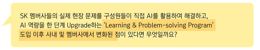 mySUNI PBL 프로그램 도입 후 SK 멤버사에서의 가장 큰 변화는 프로그램에 참여하시는 SK멤버사 구성원분들의 데이터 분석과 AI 활용을 통한 문제 해결 역량이 크게 향상된 것입니다. 데이터 분석 경험이 없던 참여 구성원분들께서도 데이터 분석, AI 기술의 필요성과 효과를 느끼셨으며, 현업의 문제 해결을 통한 가치 창출과 프로그램 참여 만족도 향상 등의 긍정적인 반응으로 mySUNI PBL 프로그램에 참여하는 SK 멤버사의 수가 매년 증가하는 것으로 이어지고 있습니다.