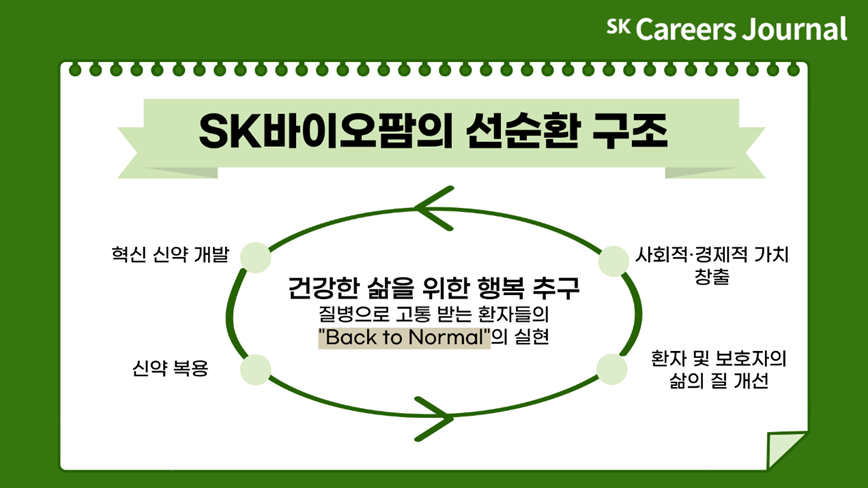 SK바이오팜은 인류의 건강을 책임지는 글로벌 제약기업으로서 선순환 구조를 실천하고 있습니다. 혁신 신약 개발을 통해 환자와 보호자의 삶의 질을 개선하고 사회적 가치와 경제적 가치를 창출해 내는 구조입니다.