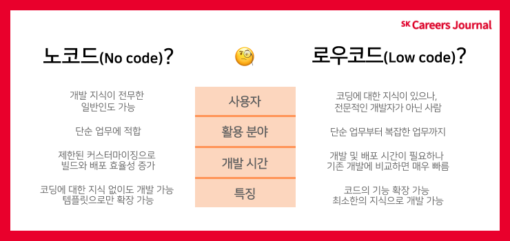 이러한 문제를 해결하기 위해 소프트웨어 개발 방식에 ‘로우 코드 (Low Code)’와 노코드(No Code)가 등장했습니다. 특정 기능을 구현할 수 있는 템플릿을 활용하여 많은 개발 지식 없이도 사용자가 원하는 기능을 쉽게 구현할 수 있게 된 것입니다.