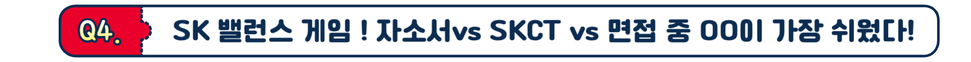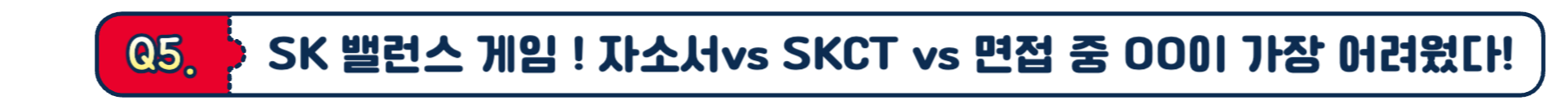 이경진 매니저님: 저는 SKCT가 가장 어렵다고 느꼈습니다. 제가 아무래도 근무와 취업 준비를 병행하다 보니, 타 지원자들보다 인·적성에 투자하는 시간이 상대적으로 적더라고요. 따라서 원하는 점수가 예상보다 쉽게 나오지는 않았던 것 같습니다. 그래도 저는 기출 문제들을 꾸준히 풀어보고, 유튜브의 수리 영역 꿀팁 등을 찾아보며 극복했던 것 같습니다!