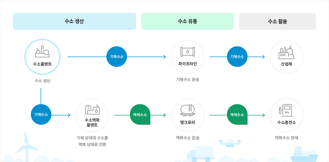 또한 앞서 액화수소 드론으로 짧게 언급되었던 ‘액화수소’에 대해서 설명드리자면, 현재 국내에서 유통되고 있는 수소의 대부분은 ‘기체수소’입니다. 기체수소는 아무래도 부피가 크기 때문에 밀도가 떨어진다는 단점이 있습니다. 따라서 이러한 기체수소의 단점을 극복하고자 고안해낸 것이 바로, ‘액화수소’입니다. 액화시켜서 유통하기 때문에 더 많은 양의 수소를 탱크로리에 실을 수 있다는 장점이 있습니다. *ccus: 온실가스 배출원에서 발생하는 이산화탄소를 포집(Capture) 후 저장(Storage)하거나 직접 사용 혹은 전환하여 활용(Utilization)하는 기술. *개질(reforming): 중질 가솔린에 고온처리를 함으로써 성분인 탄화수소의 구조를 변경시켜 옥테인값이 높은 고급 가솔린을 제조하는 조작을 뜻함.