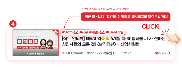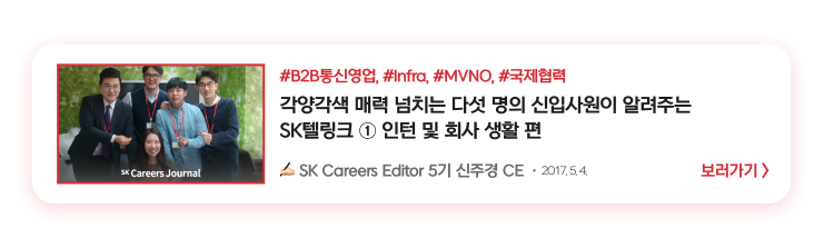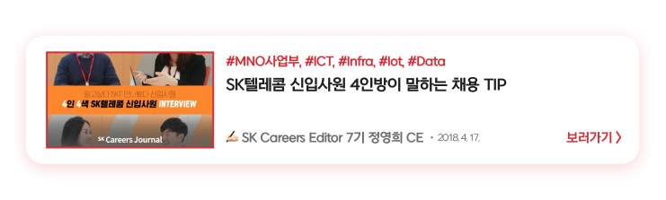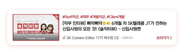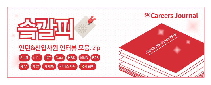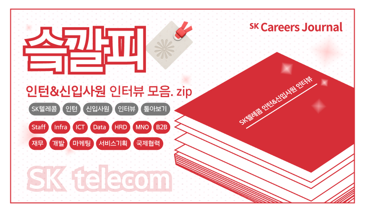 Staff직군부터 Infra, ICT, Data, HRD, MNO, B2B, 재무, 개발, 마케팅, 서비스기획, 국제협력까지! 정말 다양한 직군과 직무의 인턴&신입사원 인터뷰를 만나볼 수 있었습니다. 한눈에 확인하시는 데 도움이 되었길 바라며, 다음 슼갈피는 어디에 꽂힐지 많은 기대 부탁드립니다.