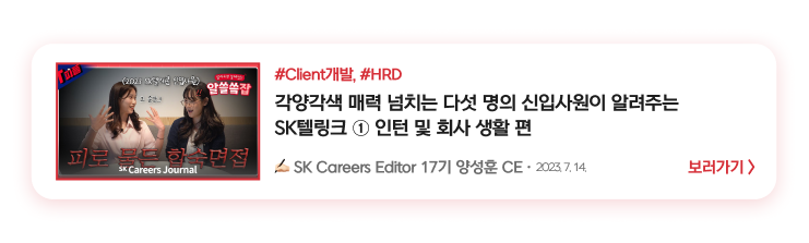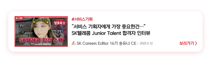 자기소개서, SKCT, 면접 전형을 준비할 때 초점을 맞춘 부분들이 상세하게 담겨있어요🥸다양한 직무의 신입사원 인터뷰가 궁금하다면 바로 확인해 보세요!