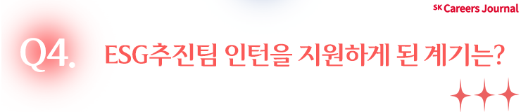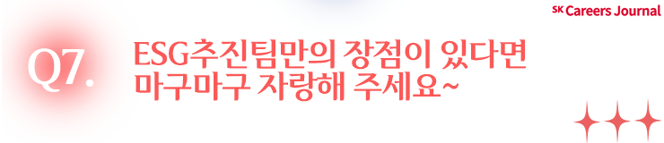 이전에 환경단체 쪽의 인턴 경험을 하며 환경 문제에 관심을 가지게 되었습니다. 그곳에서 일하며 느낀 점은, 그래도 큰 변화는 개개인보다 기업과 같이 영향력이 있는 곳에서 만들어야 파급력 있게 전달된다는 것입니다. 그러던 중 ESG라는 새롭게 떠오르는 키워드에도 자연스럽게 관심이 갔고, 사회적 가치 등을 적극적으로 추구하는 SK그룹에도 관심을 가지게 되었던 것 같습니다. 환경 분야를 꽤 실무적으로 배워온 터라 그 부분엔 자신도 있었고, 알기만 하는 것이 아닌 진짜 변화를 만들 수 있는 곳에서 일해 보고 싶다는 생각이 제가 ESG추진팀을 고른 가장 큰 이유가 아닐까 싶습니다.
