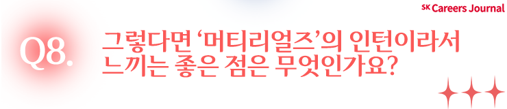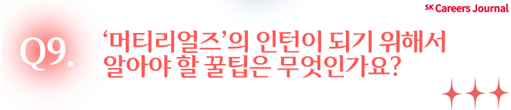 앞으로의 성장이 더 기대되는 머티리얼즈인 만큼, 지금 당장 내 경력이나 자격증 등등으로 안 될 것 같다고 겁먹고 물러서기보다는 본인의 강점을 잘 드러내셔서 머티리얼즈에서 업무하실 수 있으시길 바랍니다! 😊