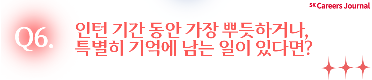 특정한 일보다는 팀원분들이 ‘잘했네요~’ 해 주실 때가 제일 뿌듯한 것 같습니다. ‘기업’에서는 일이 처음이라 처음에 많이 헤맸는데, 그럴 때 팀원분들의 ‘잘했다’ 한마디가 되게 감사하고 뿌듯했던 것 같습니다. 그리고 기억에 남는 건 지속가능경영보고서를 작성하기 위해 SK스페셜티 영주 공장에 인터뷰를 다녀왔던 건데요. 수많은 조직들이 ESG경영에 관련된 일을 이렇게 열심히 하고 있구나 싶은 생각이 들었어서 그런지 조금 힘든 일정이긴 했지만 남는 게 정말 많았던 방문이었습니다.