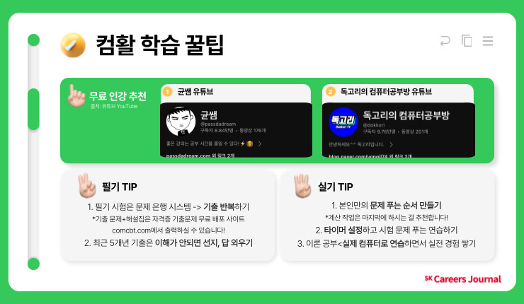 우선 필기시험은 문제은행 시스템입니다. 기출을 많이 반복할수록 공부하면서 봤던 문제를 시험장에서 마주할 수 있어요! 따라서 최근 5개년 기출은 달달 외울 정도로 공부하는 것을 추천해요. 다음으로 실기 시험은 타임 어택이 있기 때문에 본인에게 가장 잘 맞는 문제 풀이 순서를 정해놓는 것이 좋아요. 또 인강이나 글로만 공부하기보다는 실제 컴퓨터로 실전 연습을 반복하는 것이 중요합니다! 🖱 필기/실기 모두 유튜브에 있는 무료 인강을 적절히 활용하면 더 좋겠죠?