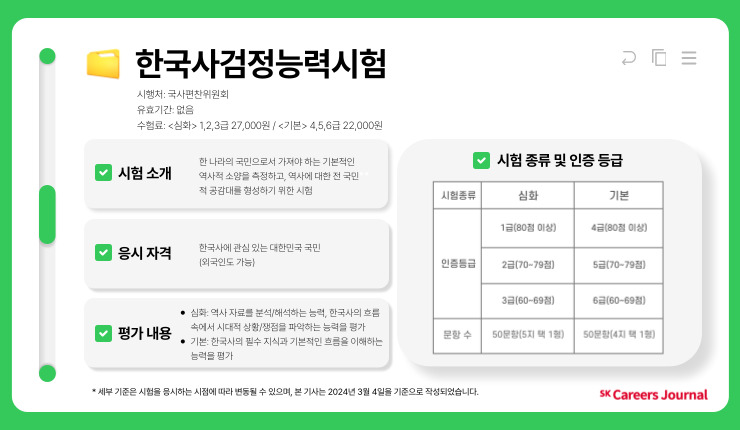 두 번째로 소개할 자격증은 한국사검정능력시험(a.k.a.한능검📄)입니다. 한국사검정능력시험 역시 대중화되어 있는 자격증 시험이죠. 접수 인원이 몰릴 때는 서버가 터지는 일도 발생하니 꼭 원서 접수는 미리 해두는 것으로 해요! 🤙 그럼 시험의 전반적인 개요에 대해 살펴봅시다!
