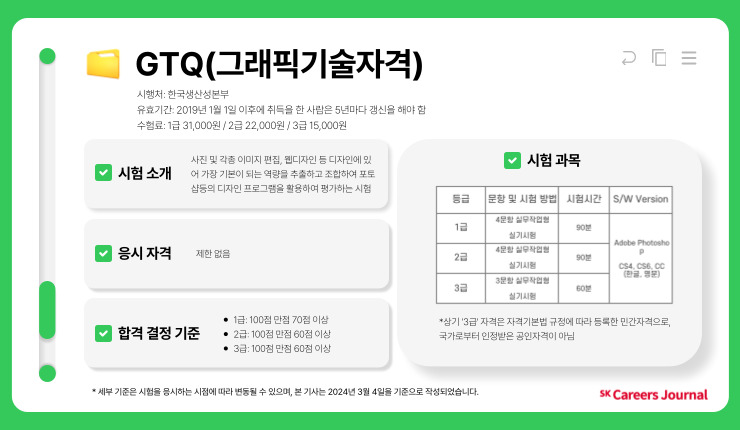 GTQ 자격을 취득한다면, 대외활동 시 디자인 능력을 어필할 수 있고, 취업 시 툴을 다룰 수 있음을 국가공인 자격으로 입증할 수 있기에 디자인 전공 외 일반 계열 전공 대학생들도 많이 응시하고 있는 추세입니다.