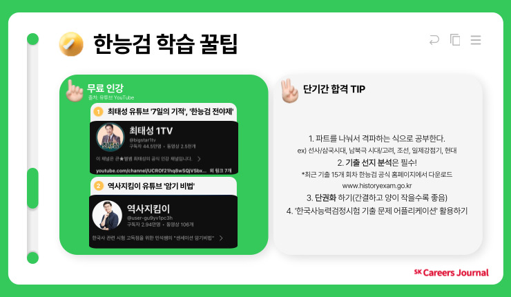 우선 최태성 강사님의 강의는 유튜브와 이투스에서 무료로 진행되고 있으니 독학러들에게 강력 추천드립니다. 특히 한국사능력검정시험이 시행되기 하루 전 날 ‘한능검 전야제’라는 라이브 방송을 통해 총정리를 해주시는 데 이 강의가 매우 유익합니다! 👍 암기 노하우를 전수해 주는 채널은 자투리 시간에 활용하면 좋겠죠? 단기간 합격을 목표로 하는 만큼 밀도 있고, 효율적인 공부 방법이 중요하겠네요. ⭐